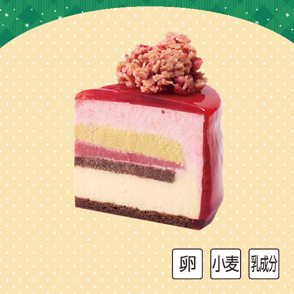 いちごのムースとバニラのババロアにピスタチオのブリュレといちごのジュレをサンド。真っ赤ないちごのルージュグラサージュが目を惹きます。