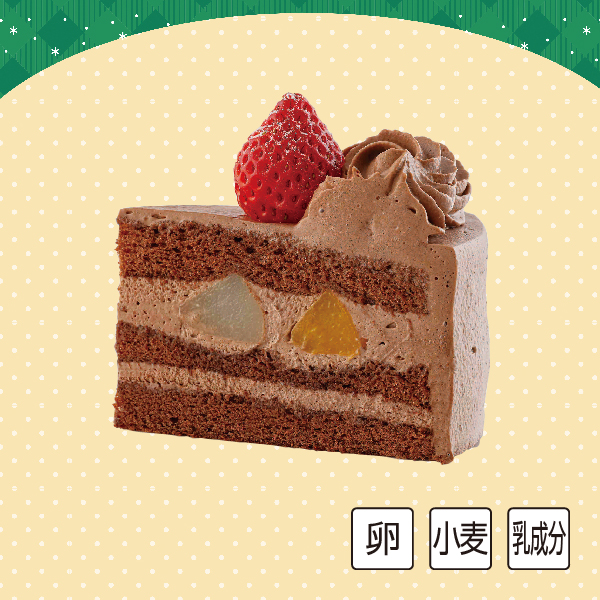 ココアのスポンジにチョコ生クリームと洋梨・黄桃をサンドしました。