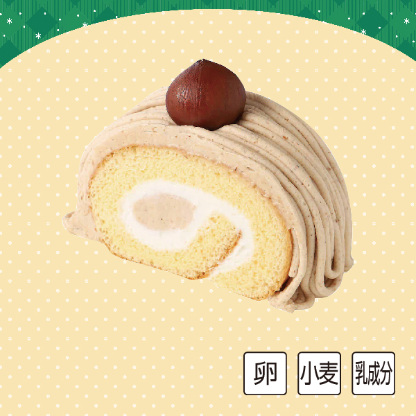 ロールケーキの中にホイップクリームとマロンホイップクリームを巻き込みました。上面には、マロンホイップクリーム、渋皮付きマロンをトッピングし上品なイメージに仕上げました。