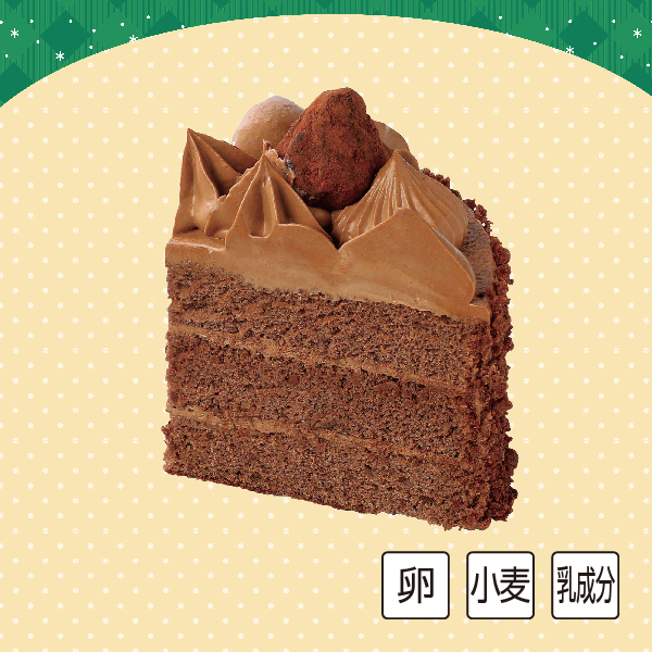 生クリーム入りのこだわりチョコホイップクリームを使ったチョコケーキです。表面にはチョコレートソースとチョコトリュフ、サイドにはチョコビスケットクランチをトッピングした、チョコづくしのケーキをご堪能ください。