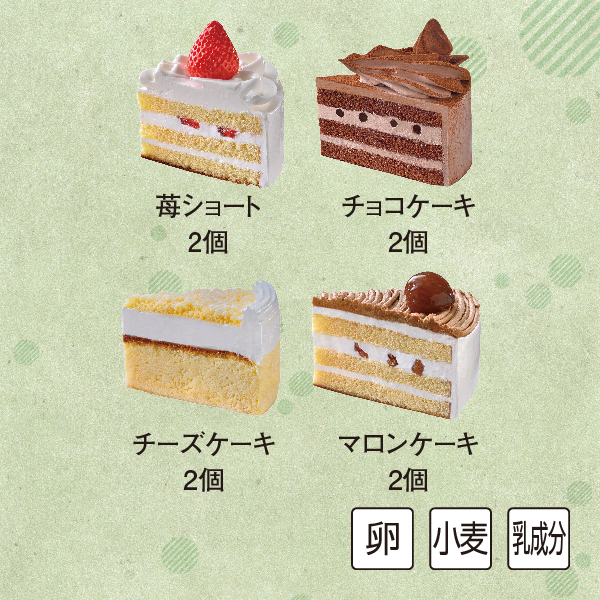 4種類の味が楽しめるパーティーにぴったりのクリスマス ケーキです。(苺ショート2個、チョコケーキ2個、チーズケーキ2個、マロンケーキ2個)