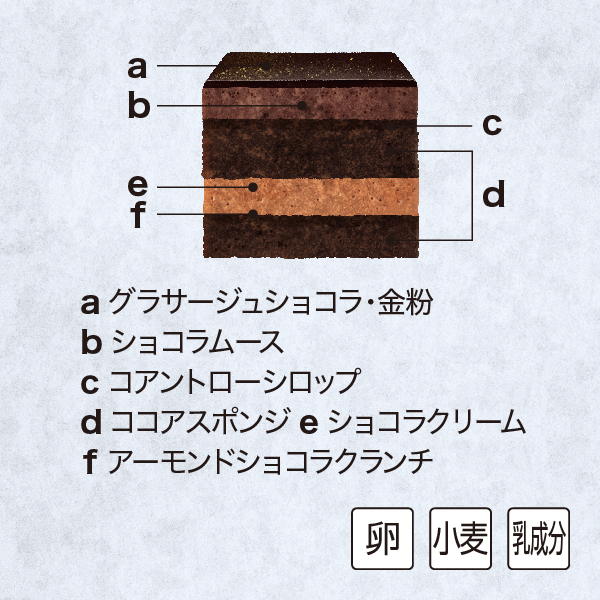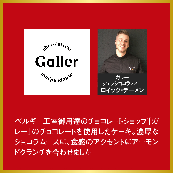 ベルギー王室御用達のチョコレートショップ「ガレー」のチョコレートを使用したケーキ。濃厚なショコラムースに、食感のアクセントにアーモンドクランチを合わせました。