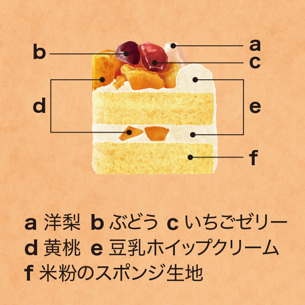 米粉のスポンジに豆乳ホイップクリームと黄桃をサンド。黄桃・洋梨・ぶどう・いちごゼリーをトッピングしました。