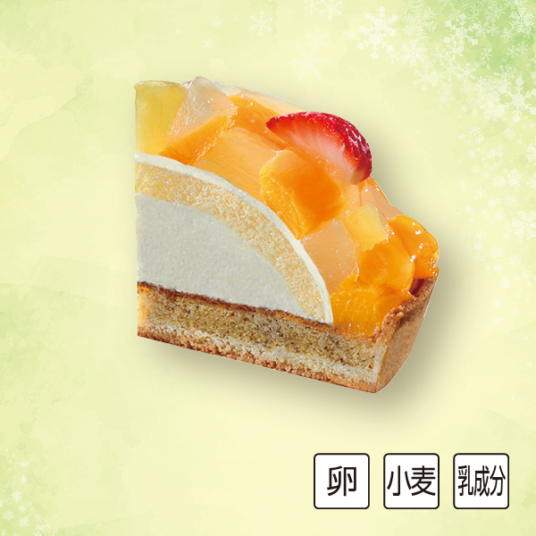 黄桃・白もも・洋ナシ・パイン・苺の5種類のフルーツを楽しめるフルーツタルトです。※苺は別添です。(写真はトッピング例になります。苺はカットされておりません。)