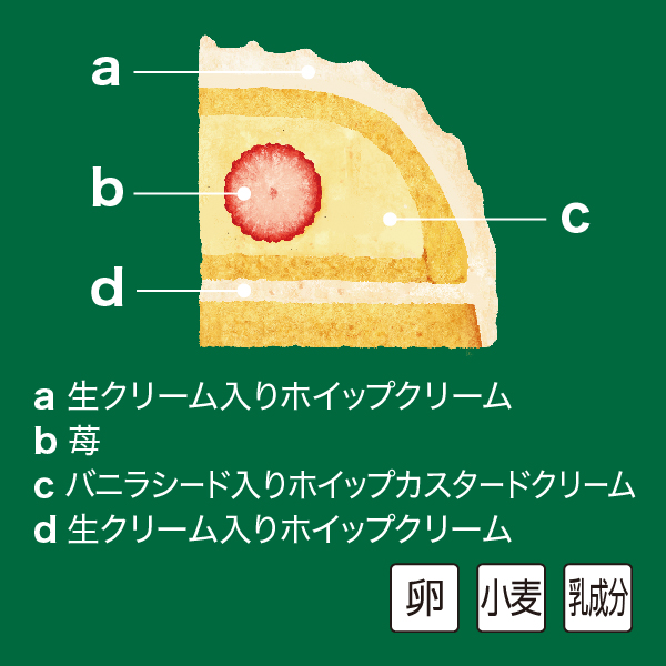 苺まるごと4個をホイップカスタードクリームで包み、表面に生クリーム入りホイップクリームを使用しました。