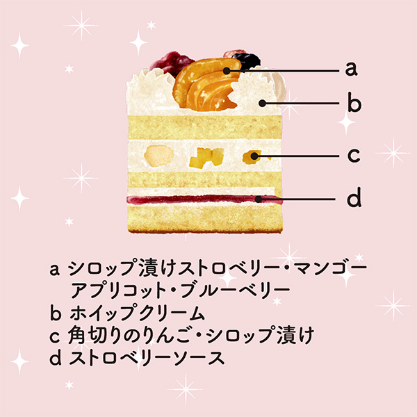 角切りのりんごシロップ漬けをサンドし、4種のフルーツを飾ったショートケーキです。