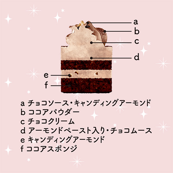 アーモンドペースト入りチョコムースをココアスポンジでサンドした、アーモンド風味のショコラケーキです。