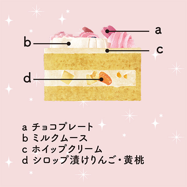 りんごと黄桃のシロップ漬けをサンドしたケーキにミルクムースのハローキティ&ハローミミィをトッピングしました。