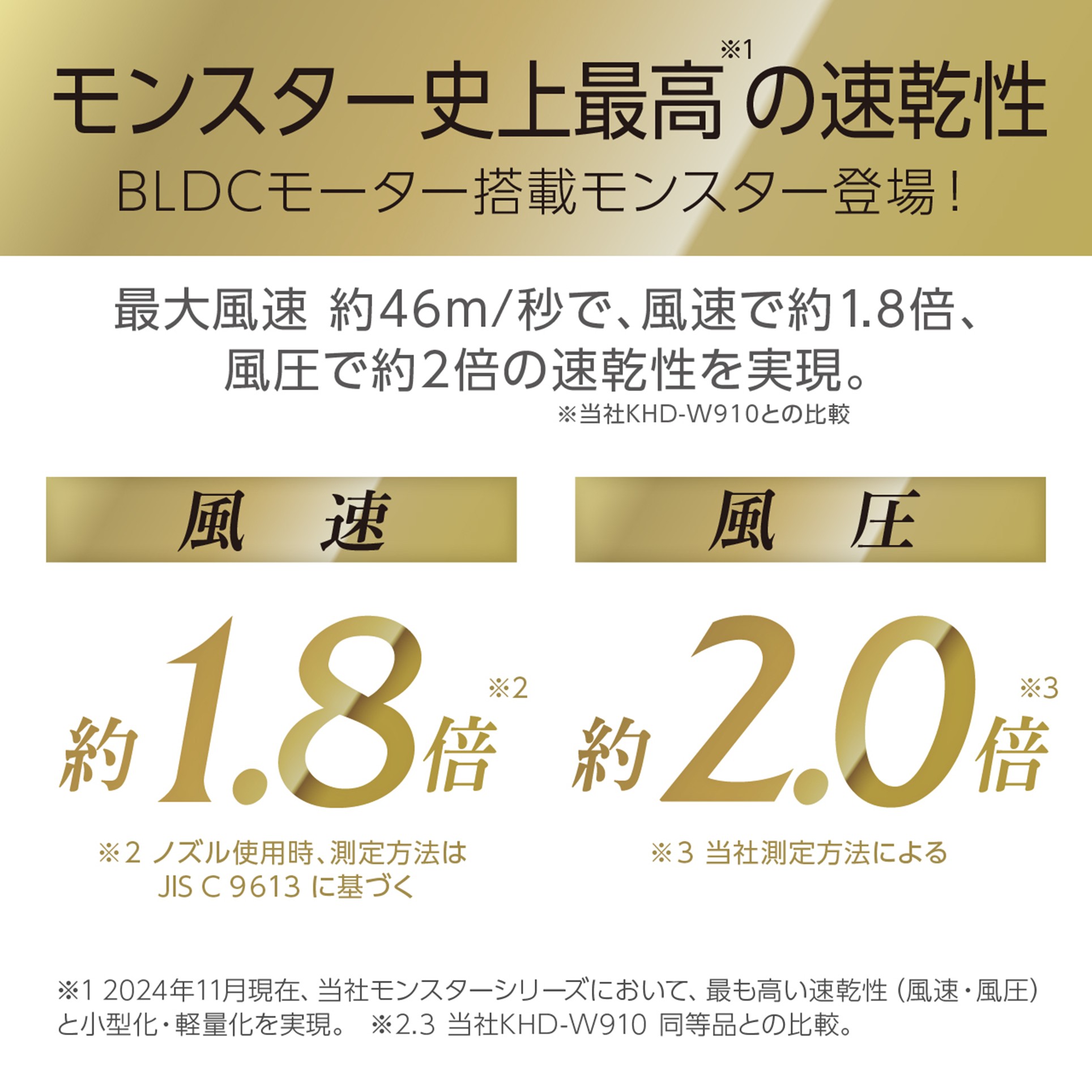 風速約1.8倍、風圧約2.0倍(KHD-W910比)、BLDCモーター搭載。