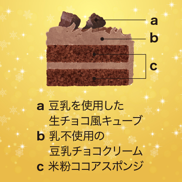 米粉でつくったふんわりとしたココアスポンジに、乳不使用チョコクリームでコーティング。華やかな絞りの上に、生チョコ風キューブをトッピングして仕上げました。