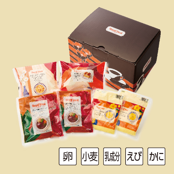 洋食の定番「煮込み風ハンバーグ」、海老の旨みが味わえる「海老のマカロニグラタン」、コーンの甘みを楽しめる「コーンのポタージュ」と、「英国風パン」を詰め合わせました。「Royal Host Deli」の人気のメニューが揃ったセットです。