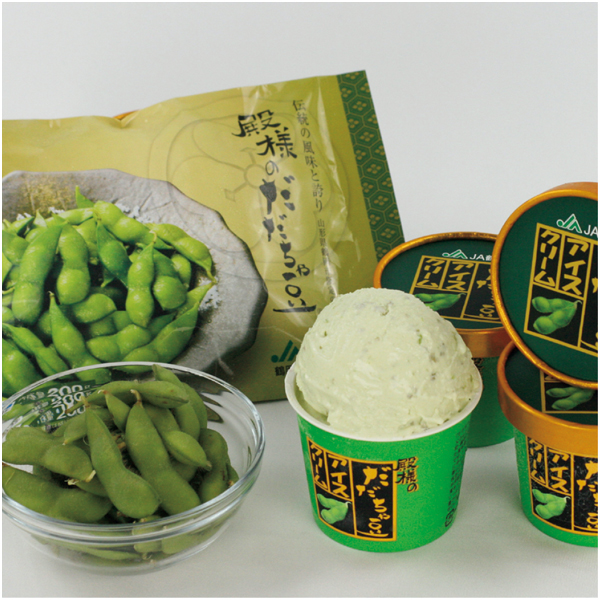 香りの枝豆「だだちゃ豆」とつぶつぶ感を感じるアイスクリームのセット。滑らかな口どけも特徴です。