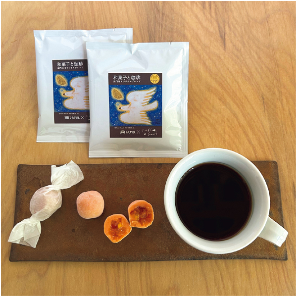 会津みしらず柿のおいしさを表現した一口菓子の是山と、和菓子によく合うようにブレンドされたオリジナルのドリップコーヒーの詰合せ。