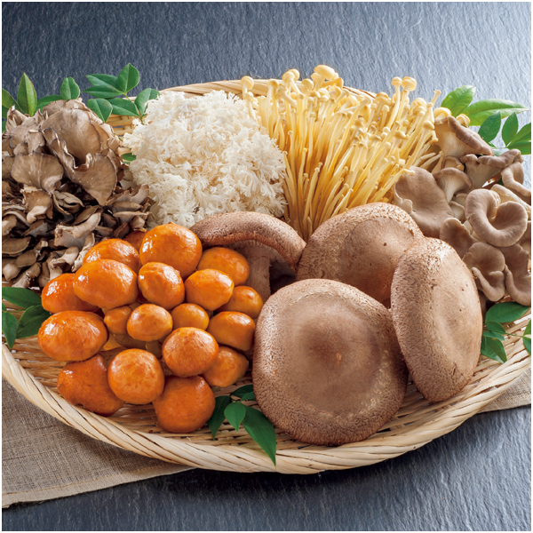 三ツ星しいたけ80g以上、ジャンボなめこ180g以上、山伏茸100g以上、ひらたけ80g以上、琥珀茸150g以上、舞茸140g以上