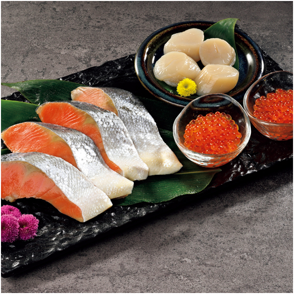 三段仕込み製法で旨みを凝縮した紅鮭切身と北海道産のいくら・ほたてを詰合せたセットです。
