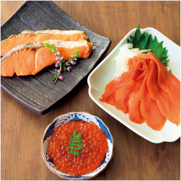 いくら醤油漬け50g×2、紅鮭スモークサーモン50g×2、塩紅鮭切身60g(甘塩味)×2