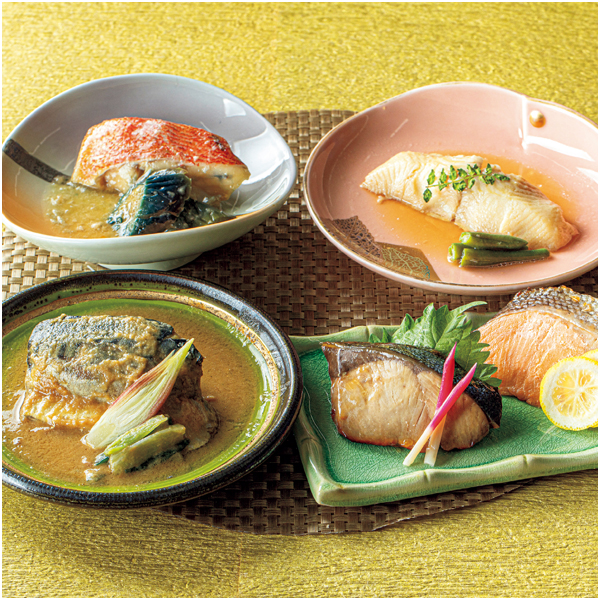 銀鮭塩麹焼・カラスガレイ煮付 各50g、ぶり照焼・赤魚和風あんかけ・さば味噌煮 各50g×2 計8