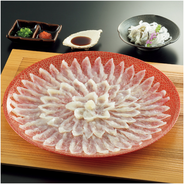 まふぐ刺身100g(山口県産)、とらふぐ皮刺身50g(国産養殖)、ぽん酢15g・もみじおろし3g 各5