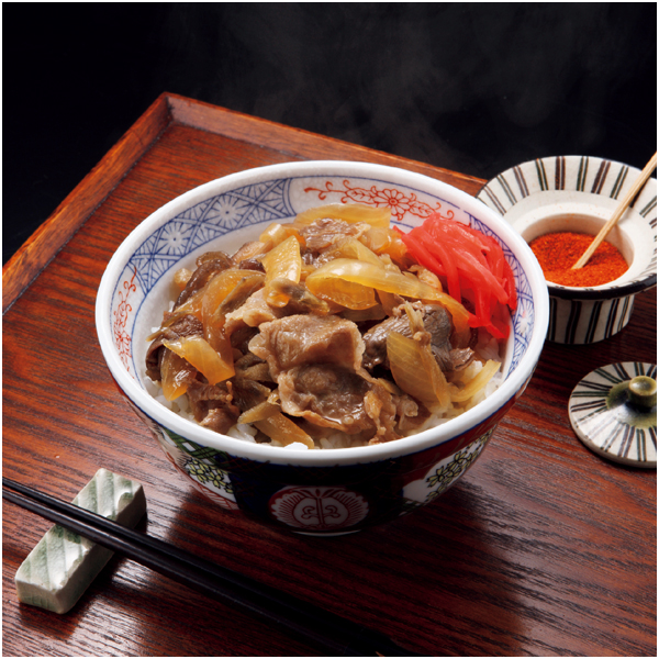 松阪牛の薄切り肉と、玉ねぎをかつお風味のたれで煮込んだ牛丼の具です。