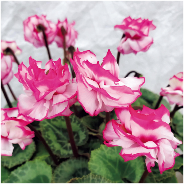 矢祭園芸の育種家 金澤美浩氏が作出した「チモ・ビクトリア」。白地にピンクの花色で縁に細かなフリルが入る八重咲き品種です。