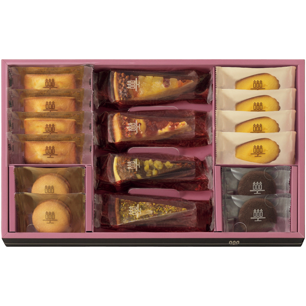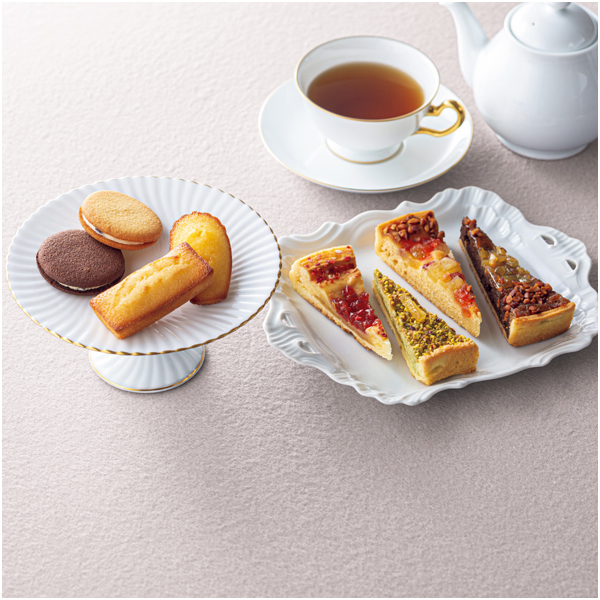 フィナンシェ4、マドレーヌ4、タルト・フリュイ4(フロマージュ・フレーズ、ピスタチオ・シトロン、ポム・ドゥース、ショコラ・マロン)、ラング・ド・シャ4(プレーン・チョコレート 各2)