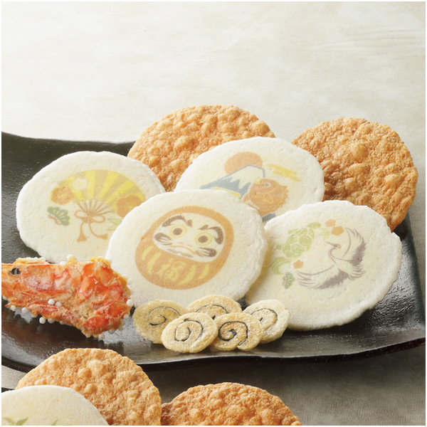 だるま、富士と鯛、鶴と亀などおめでたい絵柄のえびせんべいを詰合せた冬限定商品です。