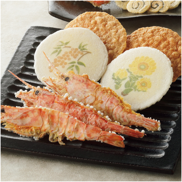 国産の車えびと甘えびの姿焼き、季節の花を描いたえびせんべいなどを詰合せました。