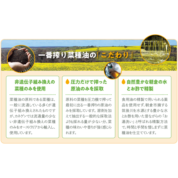 オーストラリア産非遺伝子組換菜種原料を圧搾一番搾り製法にて搾油、湯洗い製法にて精製して仕上げました。