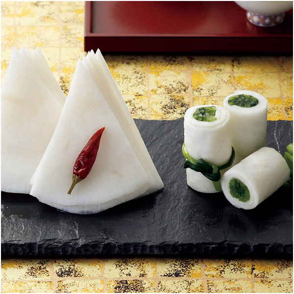 聖護院かぶらを薄く切り、一枚一枚、丁寧に漬け込んだまろやかな風味をお楽しみください。