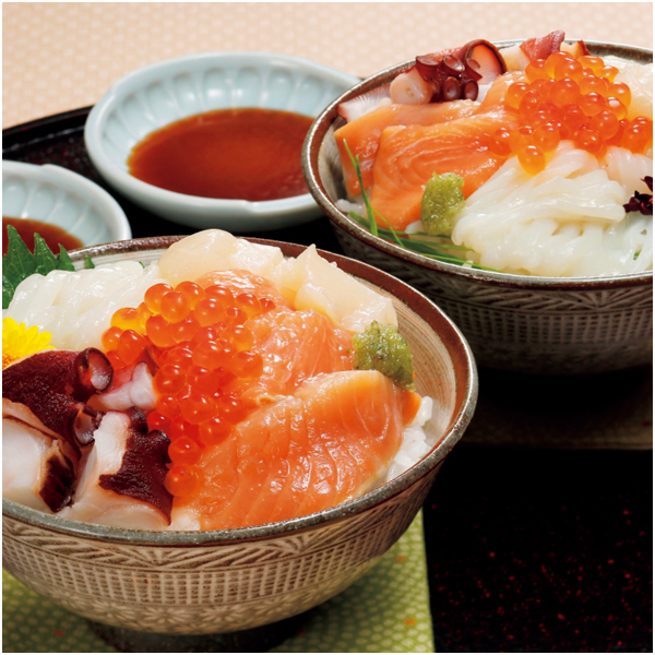 醤油漬いくら・ほたて 各40g、いか・漬け秋鮭さしみ・たこ 各40g×2、海鮮丼のたれ5