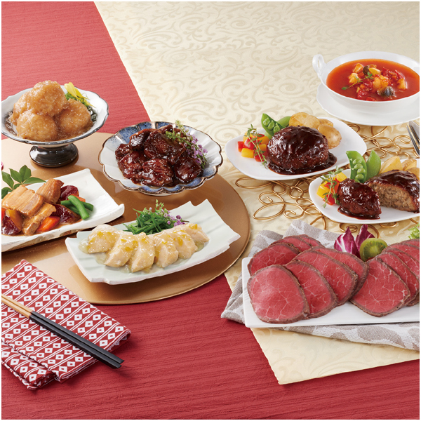 低温真空調理ローストビーフ(もも)200g、トリュフ入りグレイビーソース30g、デミグラスソースハンバーグ120g×2、8種野菜のミネストローネ200g、豚肉とさつま芋の甘辛煮150g、蒸し鶏の柚子出汁餡150g、香味叉焼180g、つくねの蕪みぞれ仕立て180g