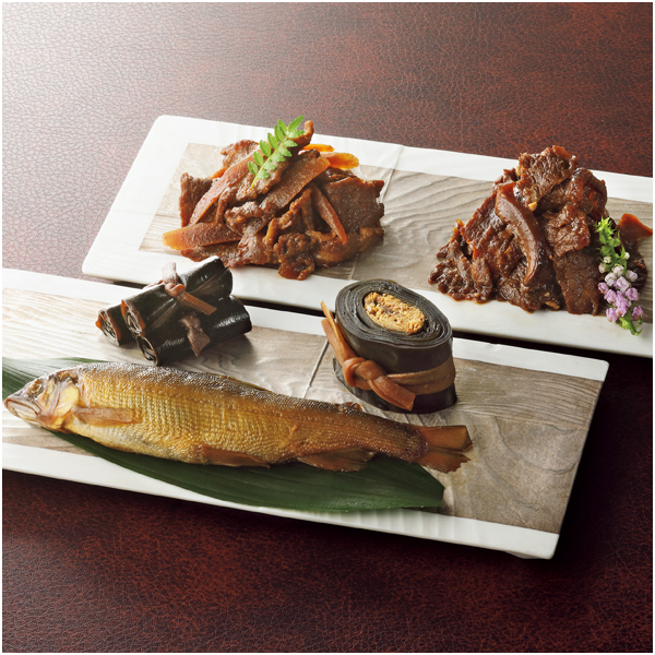 鮎昆布巻190g、牛肉しぐれ70g、鮎すがた煮75g、牛肉ごぼう味噌煮70g、一口昆布巻にしん入り100g
