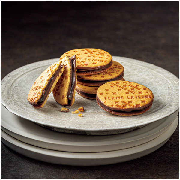 小麦の風味を感じるサクサクのクッキーを割ると、練乳ミルククリームがとろけてきます。コーティングしたチョコレートと合わせて3つのおいしさが口に広がります。