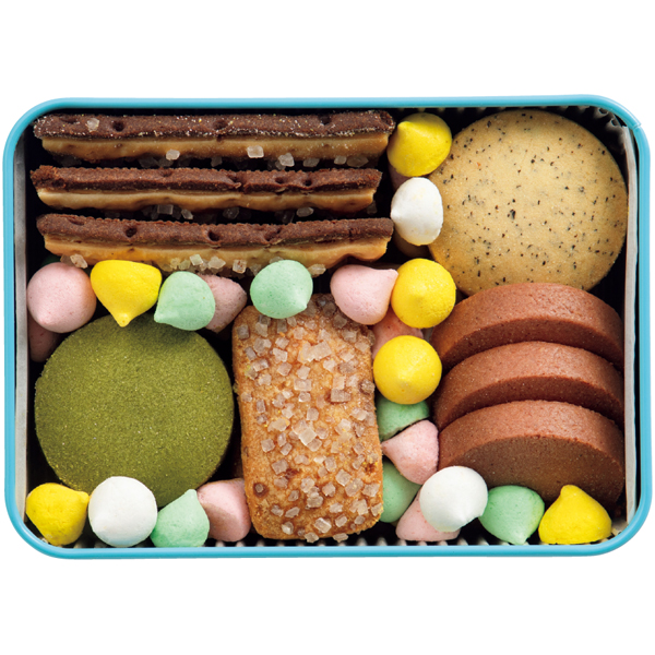 抹茶クッキー、アールグレイクッキー、ラズベリークッキー、パルメザンチーズクッキー、メレンゲ(ホワイト、ピンク、イエロー、グリーン)、パイクッキー 計155g 缶サイズ:9.9cm×13.9cm×4.8cm ※のしはご容赦ください