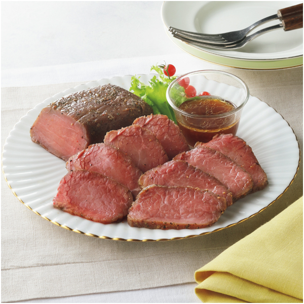 奈良三条の人気店・鉄板ステーキ シェルブルーの山口シェフ監修。低温加熱でじっくり調理し、しっとりとしたローストビーフに仕上げました。
