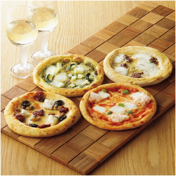 マルズワイガニとだだ茶豆のピザ130g、白身魚と魚介たっぷりのマリナーラピザ95g、シチリア産アンチョビとガーリックのピザ86g、ローストイカとイタリア産グリルズッキーニのジェノベーゼピザ105g