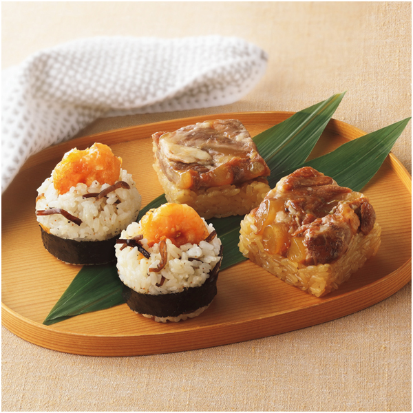 子持ちきくらげの佃煮を混ぜたご飯に海老天を忍ばせた「そば屋の天むす」と、おこわに軟骨チャーシューをのせた「軟骨焼豚おこわ」のセットです。