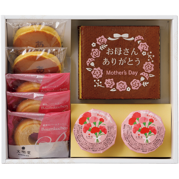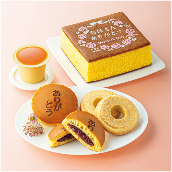 感謝の思いを伝える絵柄入りカステラと、バームクーヘン・プリン・どら焼きを詰合せたスイーツセット。