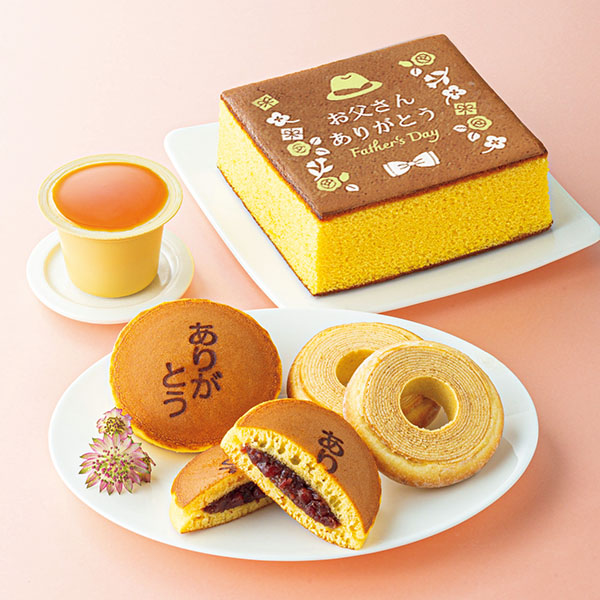 感謝の思いを伝える絵柄入りカステラと、バームクーヘン・プリン・どら焼きを詰合せたスイーツセット。