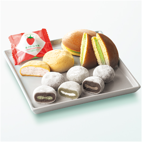 母の日苺クリーム大福(父の日黒ごま大福)4、喜久福抹茶2、喜久福ずんだ2、喜久福ほうじ茶2、ありがとうどら茶ん3、もちもちシュー3(母の日いちご、父の日キャラメル)