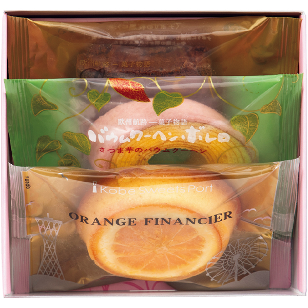 爽やかなオレンジフィナンシェと、さつま芋の風味広がるバウムクーヘン、しっとり食感のガトーショコラをセットに。