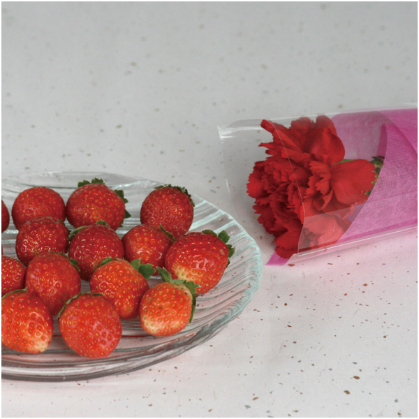 いちご(とちおとめ、16個(1個5g以上))、カーネーション(赤色)※サイズ指定はご容赦ください。