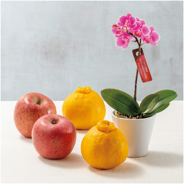 マイクロ胡蝶蘭2.5号(ピンク系)1本立ち1鉢(高さ約22cm×鉢直径約8.6cm)、デコポンM又ははLサイズ2個(1個250g以上)、ふじ又はサンふじりんごLサイズ2個(1個250g以上)※サイズ、品種指定はご容赦ください。