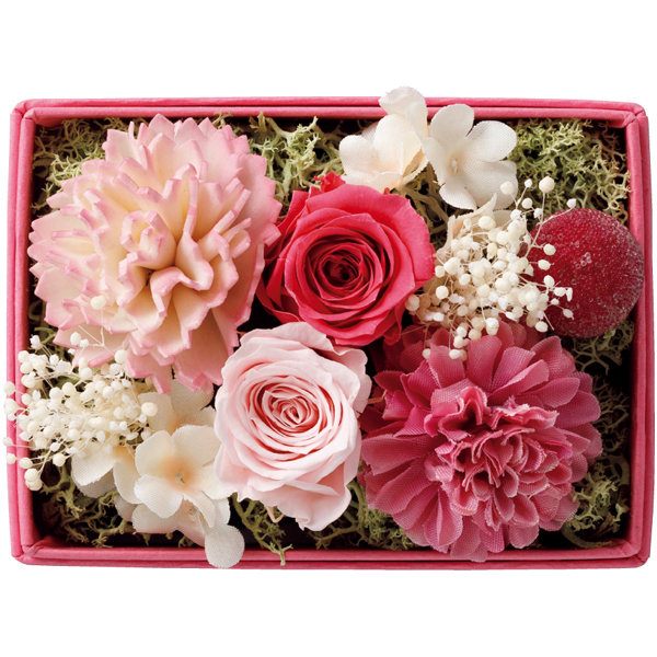 歴史ある「ホテルオークラ」のくるみ入りフルーツケーキとしっとり食感のチョコレートケーキに、プリザーブドフラワーを添えて。