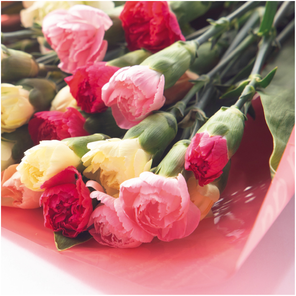 カラフルなスプレー咲きカーネーションを束ねた、目にも鮮やかなブーケ。