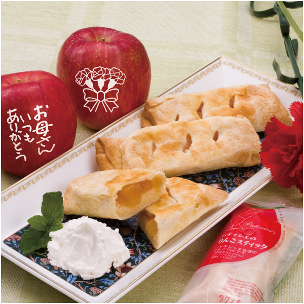 母の日に伝えたい感謝の気持ちを込めた青森県産りんごと、スティック状で食べやすい甘さ控えめなアップルパイの詰合せです。