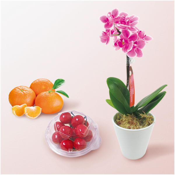 マイクロ胡蝶蘭2.5号(ピンク系)1本立ち1鉢(高さ約22cm×鉢直径約8.6cm)、カラマンダリンSサイズ12個又はMサイズ10個、佐藤錦100g以上※サイズ指定はご容赦ください。