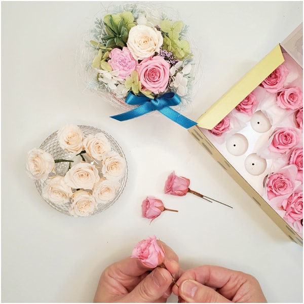 磁器の鉢に、愛らしいプリザーブドフラワーをアレンジしました。