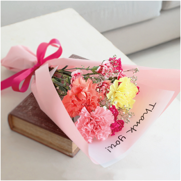 カーネーション(ピンク、イエロー、オレンジ系)、スプレーカーネション(濃ピンク系、複色系)、カスミソウ、長さ約45cm