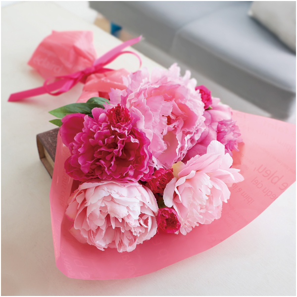 しゃくやく(ピンク系3、濃ピンク系2)、スプレーカーネーション(濃ピンク系2)、長さ約50cm ※しゃくやくはつぼみの状態でお届けします。